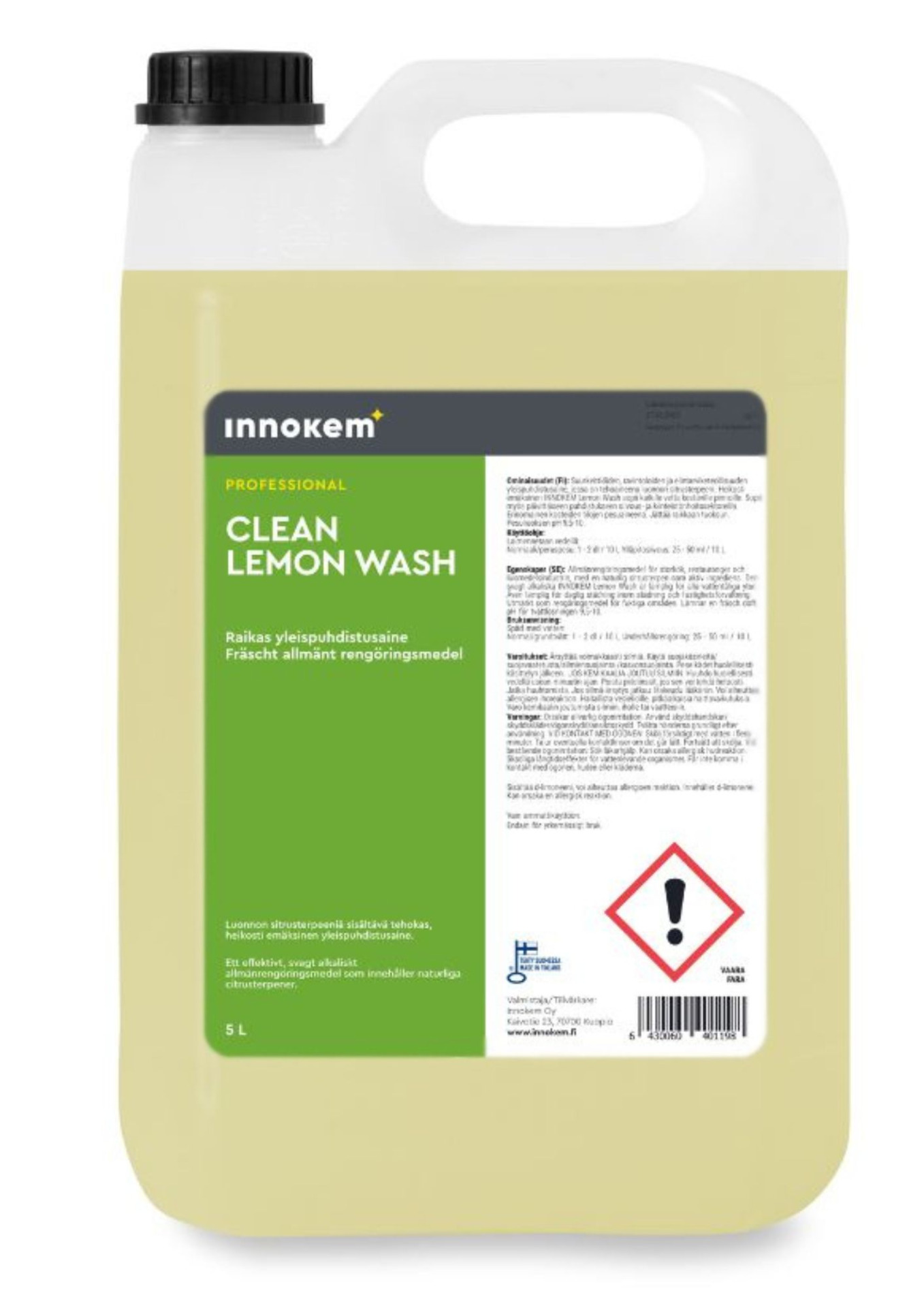 Ett allrengöringsmedel för storkök, restauranger och livsmedelsindustrin, med naturlig citrusterpen som aktiv ingrediens. Det svagt alkaliska Innokem Lemon Wash är lämpligt för alla vattenbeständiga ytor. Även lämpligt för daglig rengöring inom städ- och fastighetsskötsel. Utmärkt som rengöringsmedel för våtutrymmen. Lämnar en fräsch doft.